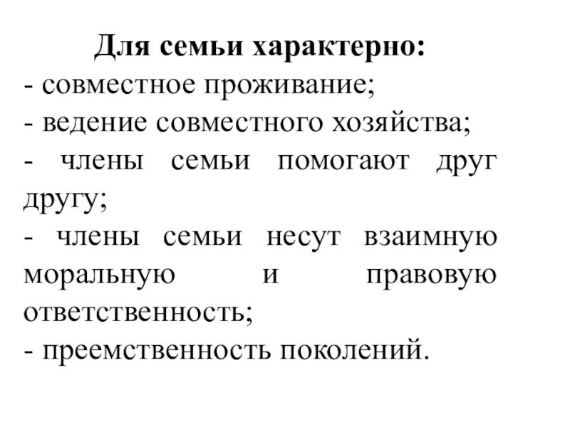 Для семьи характерно: - совместное проживание;- ведение совместного хозяйства;- члены семьи помогают друг другу;- члены семьи несут