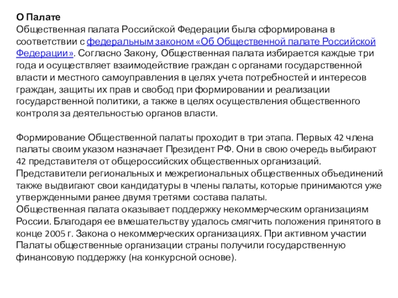 О ПалатеОбщественная палата Российской Федерации была сформирована в соответствии с федеральным законом «Об Общественной палате Российской Федерации».