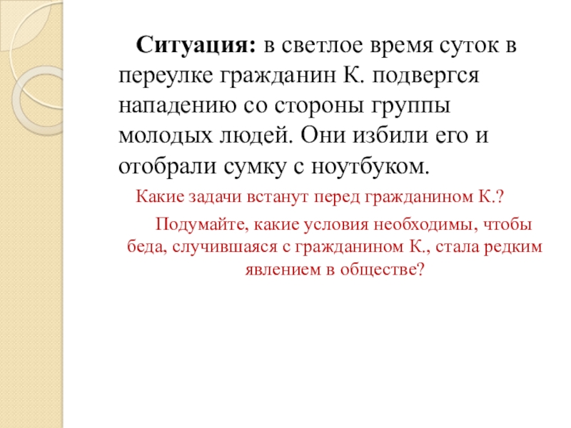Слайд 17Ситуация: в светлое время суток в переулке гражданин К. подвергся нападению