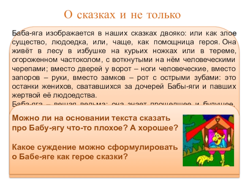 Баба-яга изображается в наших сказках двояко: или как злое существо, людоедка, или, чаще, как помощница героя. Она живёт в лесу в избушке на курьих ножках или в тереме, огороженном частоколом, с воткнутыми на нём человеческими черепами; вместо дверей у ворот – ноги человеческие, вместо запоров – руки, вместо замков – рот с острыми зубами: это останки женихов, сватавшихся за дочерей Бабы-яги и павших жертвой её людоедства.