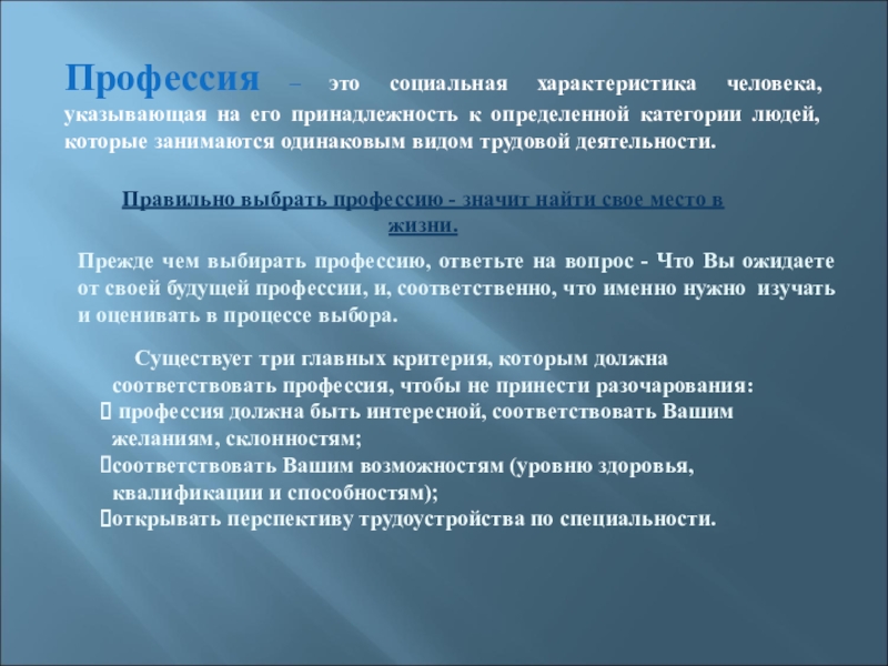 Профессия – это социальная характеристика человека, указывающая на его принадлежность к определенной категории людей, которые занимаются одинаковым видом трудовой деятельности.