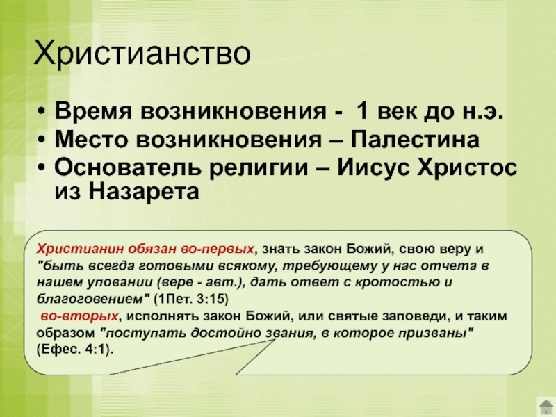 Христианин обязан во-первых, знать закон Божий, свою веру и "быть всегда готовыми всякому, требующему у нас отчета в нашем уповании (вере - авт.), дать ответ с кротостью и благоговением" (1Пет. 3:15)