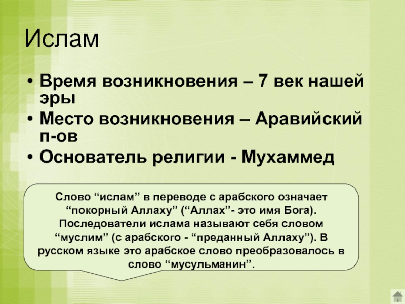 Слово “ислам” в переводе с арабского означает “покорный Аллаху” (“Аллах”- это имя Бога). Последователи ислама называют себя словом “муслим” (с арабского - “преданный Аллаху”). В русском языке это арабское слово преобразовалось в слово “мусульманин”.
