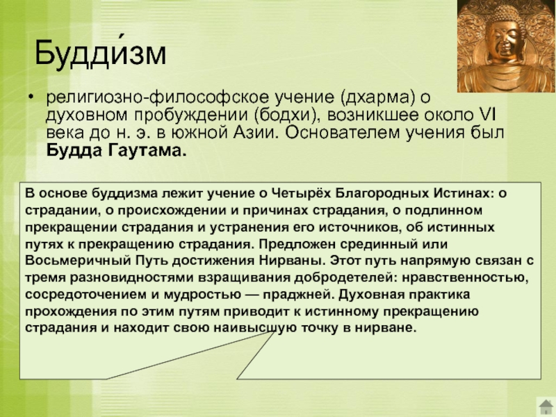 В основе буддизма лежит учение о Четырёх Благородных Истинах: о страдании, о происхождении и причинах страдания, о подлинном прекращении страдания и устранения его источников, об истинных путях к прекращению страдания. Предложен срединный или Восьмеричный Путь достижения Нирваны. Этот путь напрямую связан с тремя разновидностями взращивания добродетелей: нравственностью, сосредоточением и мудростью — праджней. Духовная практика прохождения по этим путям приводит к истинному прекращению страдания и находит свою наивысшую точку в нирване.