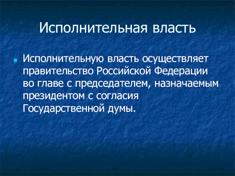 Исполнительную власть осуществляет правительство Российской Федерации во главе с председателем,