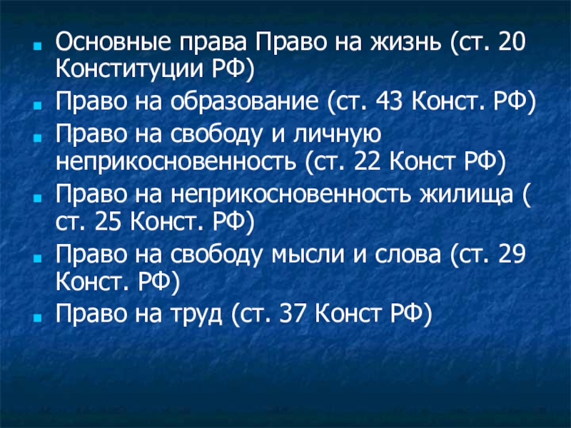 Слайд 19Основные права Право на жизнь (ст. 20 Конституции РФ)