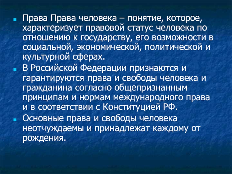 Слайд 18Права Права человека – понятие, которое, характеризует правовой статус человека по