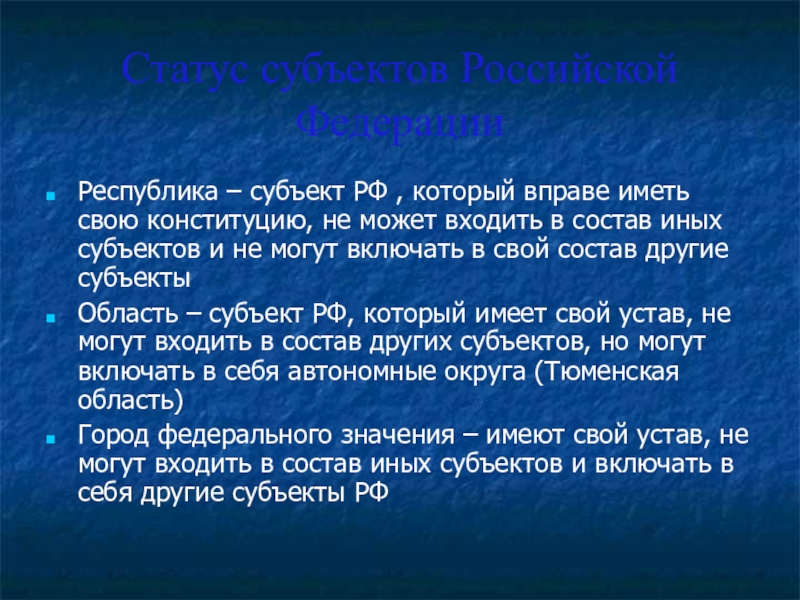 иметь свою конституцию, не может входить в состав иных субъектов и не могут включать в свой состав другие субъекты