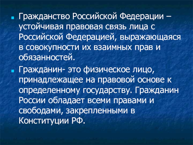 Гражданин- это физическое лицо, принадлежащее на правовой основе к определенному государству. Гражданин России обладает всеми правами и свободами, закрепленными в Конституции РФ.
