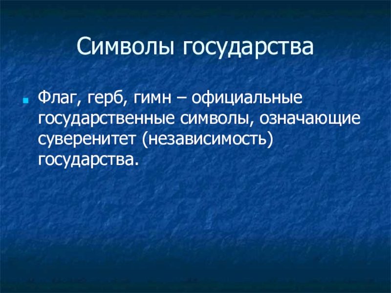 Флаг, герб, гимн – официальные государственные символы, означающие суверенитет (независимость)