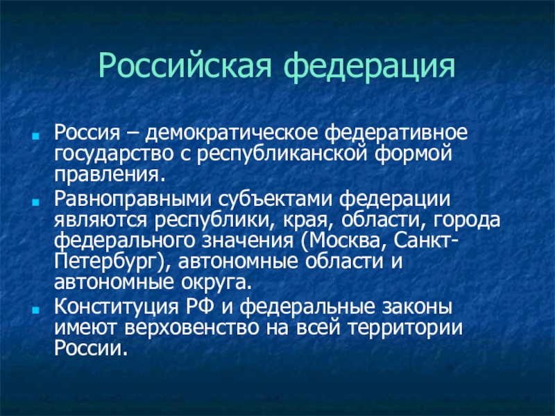 Россия – демократическое федеративное государство с республиканской формой правления.