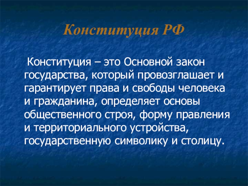права и свободы человека и гражданина, определяет основы общественного строя, форму правления и территориального устройства, государственную символику и столицу.