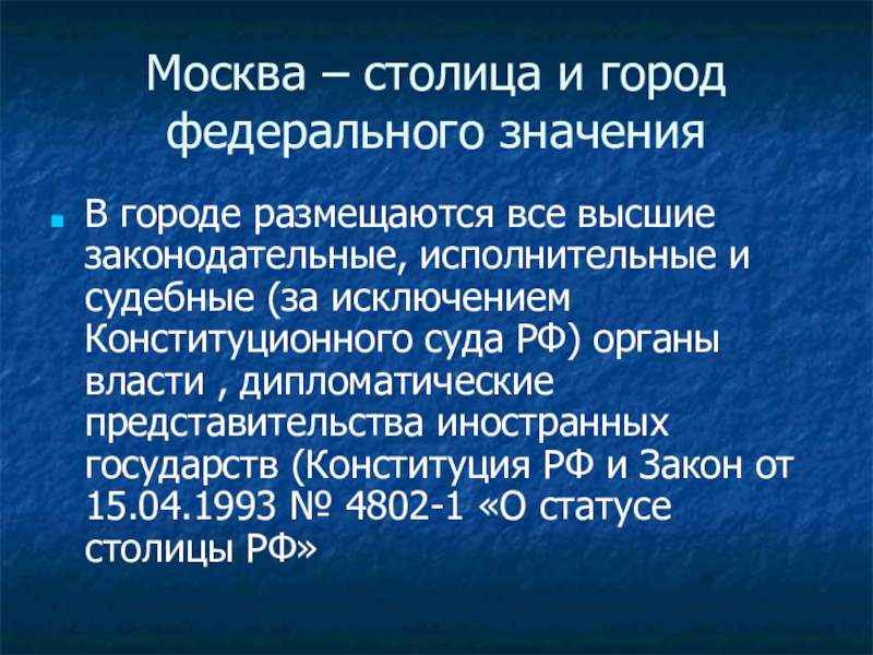 законодательные, исполнительные и судебные (за исключением Конституционного суда РФ) органы власти , дипломатические представительства иностранных государств (Конституция РФ и Закон от 15.04.1993 № 4802-1 «О статусе столицы РФ»