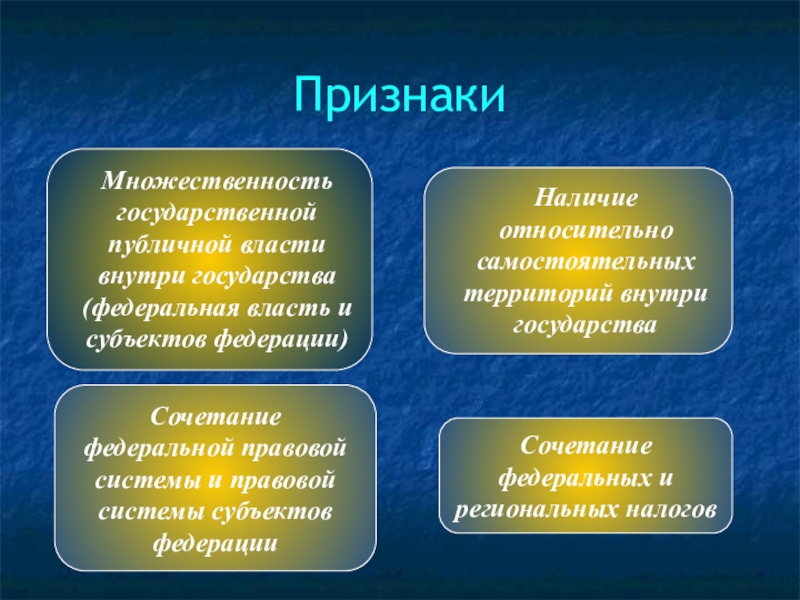 конституции, законодательные, исполнительные, судебные органы; при этом образуются единые для всех единиц органы государственной власти, единое гражданство, денежная система и т.д.
