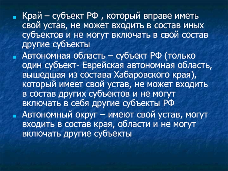 Слайд 8Край – субъект РФ , который вправе иметь свой устав, не