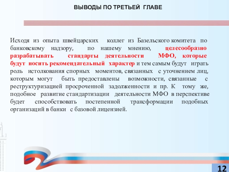 из Базельского комитета по банковскому надзору, по нашему мнению, целесообразно разрабатывать стандарты деятельности МФО, которые будут носить рекомендательный характер и тем самым будут играть роль истолкования спорных моментов, связанных с уточнением лиц, которым могут быть предоставлены возможности, связанные с реструктуризацией просроченной задолженности и пр. К тому же, подобное развитие стандартизации деятельности МФО в перспективе будет способствовать постепенной трансформации подобных организаций в банки с базовой лицензией.