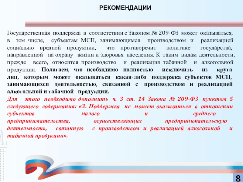Для этого необходимо дополнить ч. 3 ст. 14 Закона № 209-ФЗ пунктом 5 следующего содержания: «3. Поддержка не может оказываться в отношении субъектов малого и среднего предпринимательства, осуществляющих предпринимательскую деятельность, связанную с производством и реализацией алкогольной и табачной продукции».