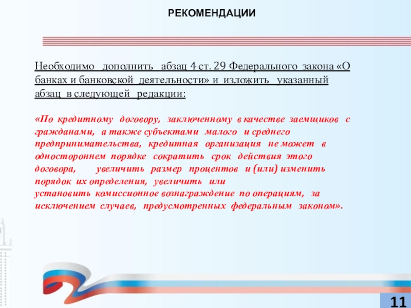 По нашему мнению, можно предложить установить запрет на включение в кредитный договор с участием субъектов малого и среднего предпринимательства условий об одностороннем изменении банком процентной ставки по кредиту.