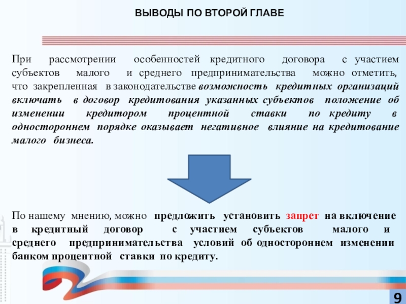 договора с участием субъектов малого и среднего предпринимательства можно отметить, что закрепленная в законодательстве возможность кредитных организаций включать в договор кредитования указанных субъектов положение об изменении кредитором процентной ставки по кредиту в одностороннем порядке оказывает негативное влияние на кредитование малого бизнеса.