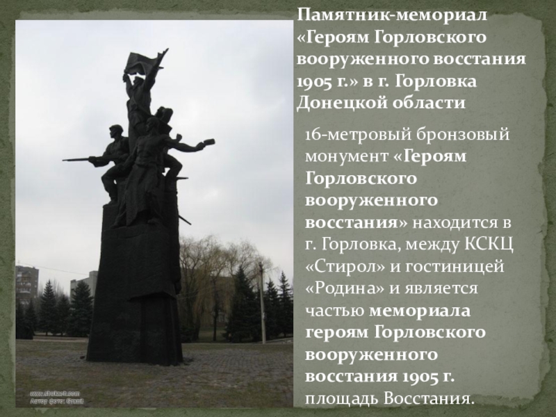 16-метровый бронзовый монумент «Героям Горловского вооруженного восстания» находится в г. Горловка, между КСКЦ «Стирол» и гостиницей «Родина» и является частью мемориала героям Горловского вооруженного восстания 1905 г.