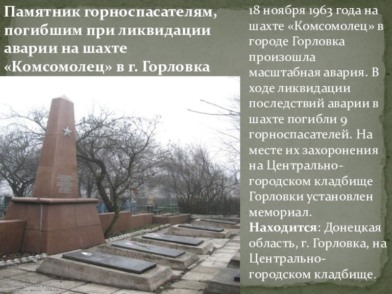 18 ноября 1963 года на шахте «Комсомолец» в городе Горловка произошла масштабная авария. В ходе ликвидации последствий аварии в шахте погибли 9 горноспасателей. На месте их захоронения на Центрально-городском кладбище Горловки установлен мемориал.