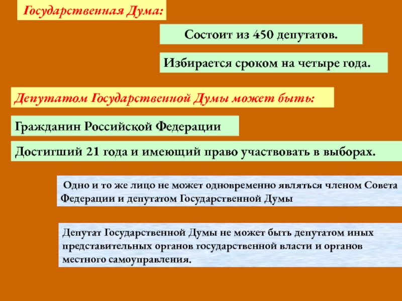 Депутат Государственной Думы не может быть депутатом иных представительных органов государственной власти и органов местного самоуправления.