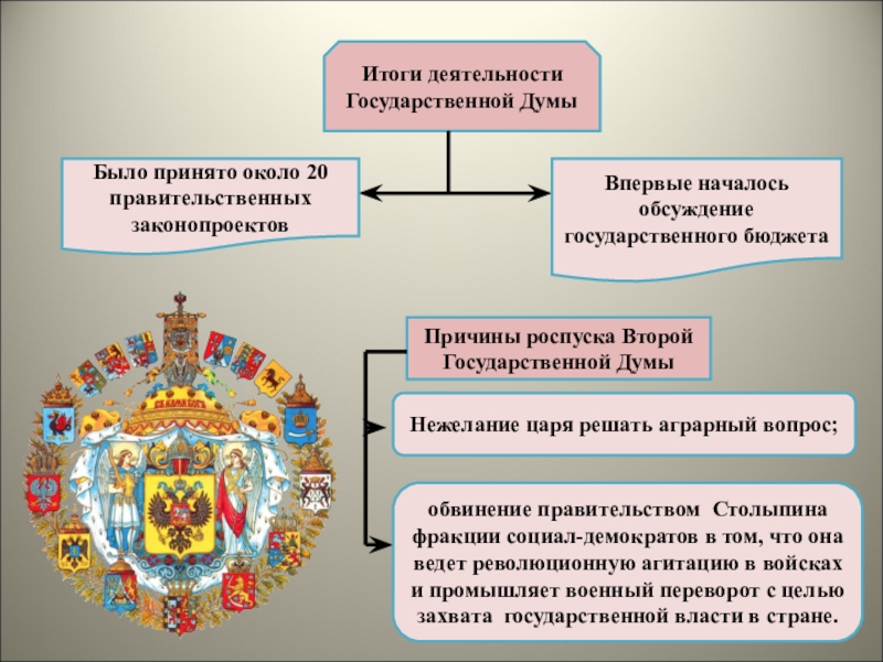 обвинение правительством Столыпина фракции социал-демократов в том, что она ведет революционную агитацию в войсках и промышляет военный переворот с целью захвата государственной власти в стране.