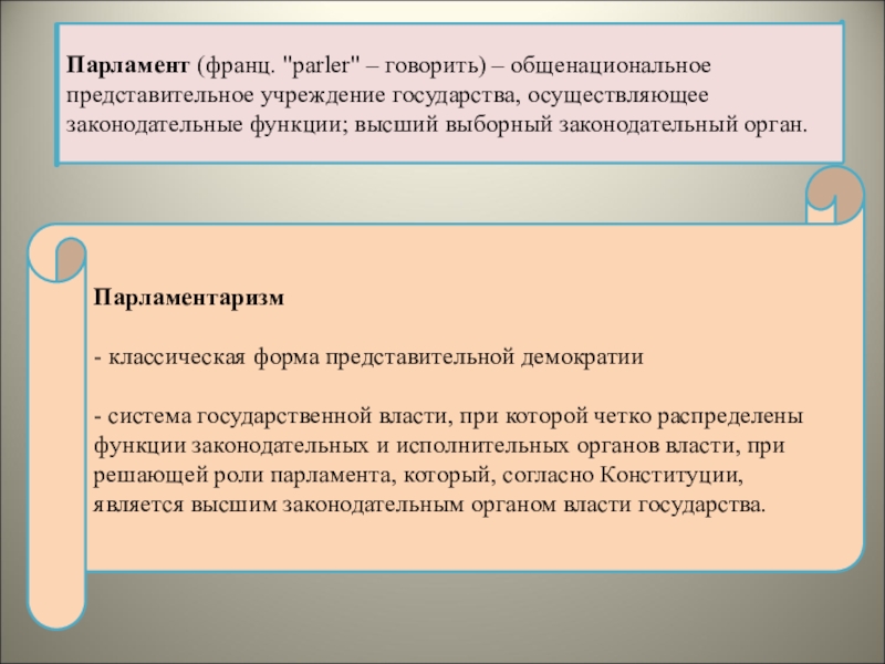 - система государственной власти, при которой четко распределены функции законодательных и исполнительных органов власти, при решающей роли парламента, который, согласно Конституции, является высшим законодательным органом власти государства.