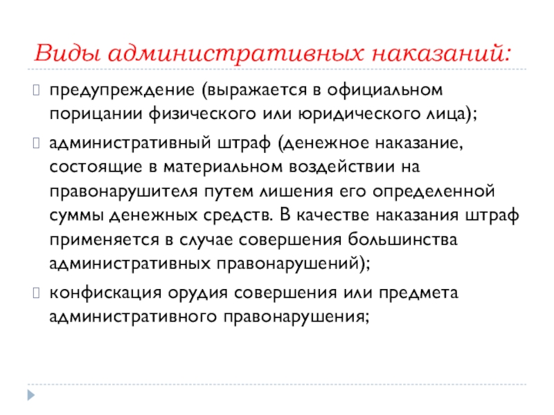 Виды административных наказаний:предупреждение (выражается в официальном порицании физического или юридического лица);административный штраф (денежное наказание, состоящие в материальном