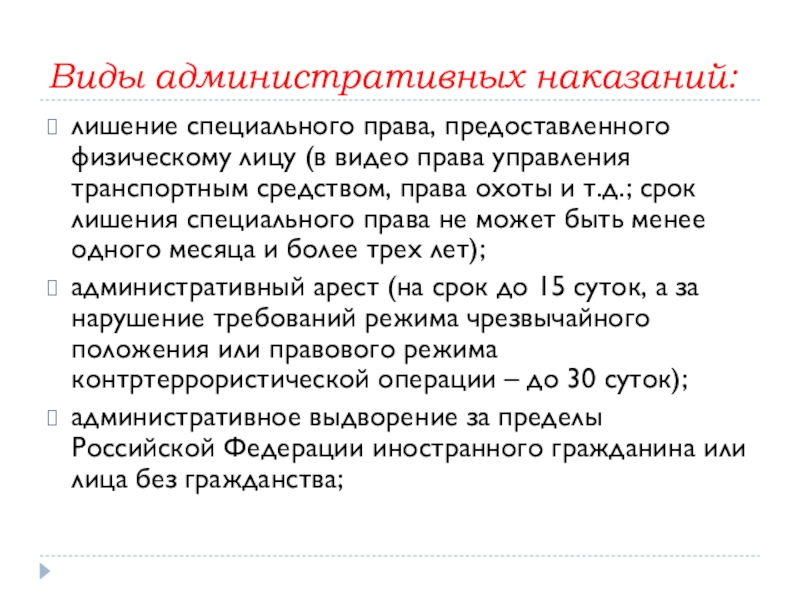 Виды административных наказаний:лишение специального права, предоставленного физическому лицу (в видео права управления транспортным средством, права охоты и