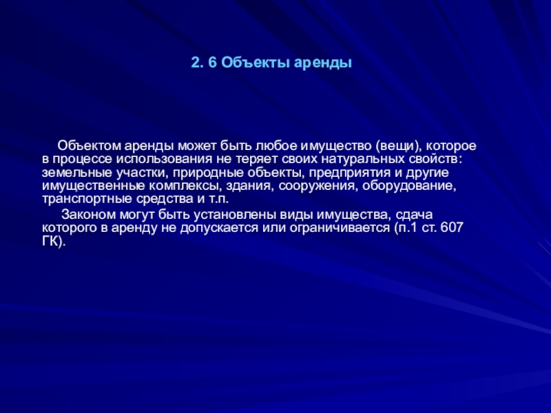 Законом могут быть установлены виды имущества, сдача которого в аренду не допускается или ограничивается (п.1 ст. 607 ГК).