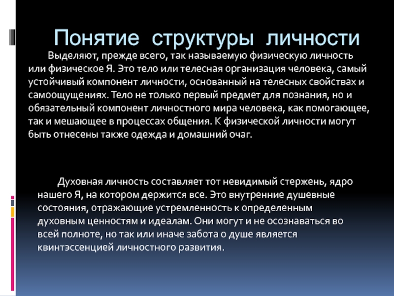 Духовная личность составляет тот невидимый стержень, ядро нашего Я, на котором держится все. Это внутренние душевные состояния, отражающие устремленность к определенным духовным ценностям и идеалам. Они могут и не осознаваться во всей полноте, но так или иначе забота о душе является квинтэссенцией личностного развития.