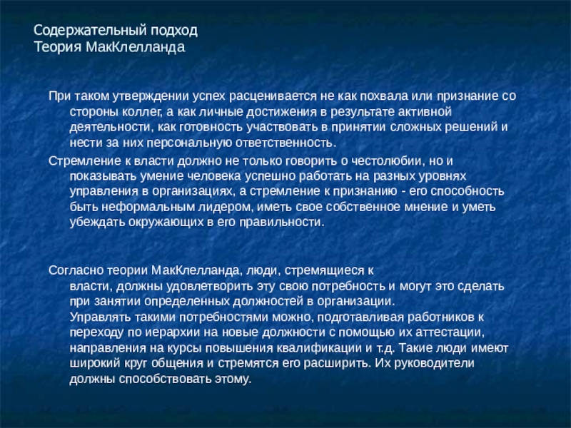 и совершенствованием управления значительная роль в теории мотивации отводится потребностям более высоких уровней. Представителем этой теории является Дэвид МакКлелланд.