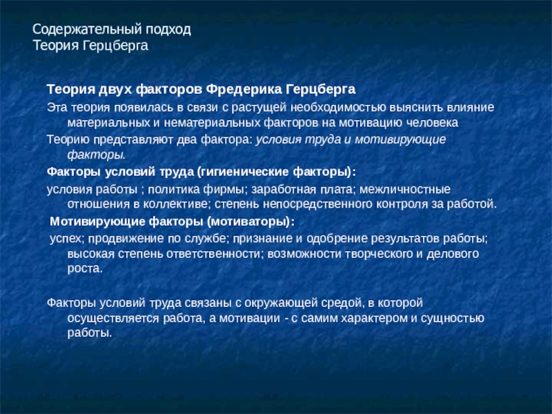 Теорию представляют два фактора: условия труда и мотивирующие факторы.