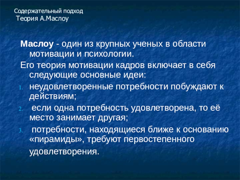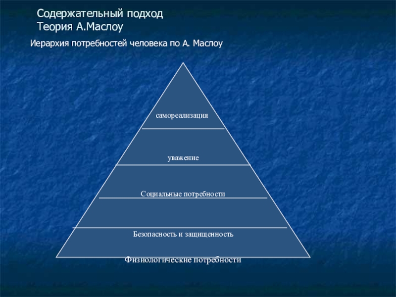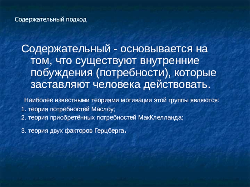 Содержательный - основывается на том, что существуют внутренние побуждения (потребности),