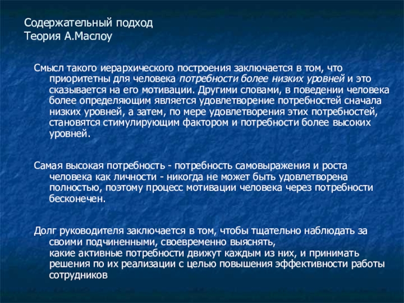 Самая высокая потребность - потребность самовыражения и роста человека как личности - никогда не может быть удовлетворена полностью, поэтому процесс мотивации человека через потребности бесконечен.