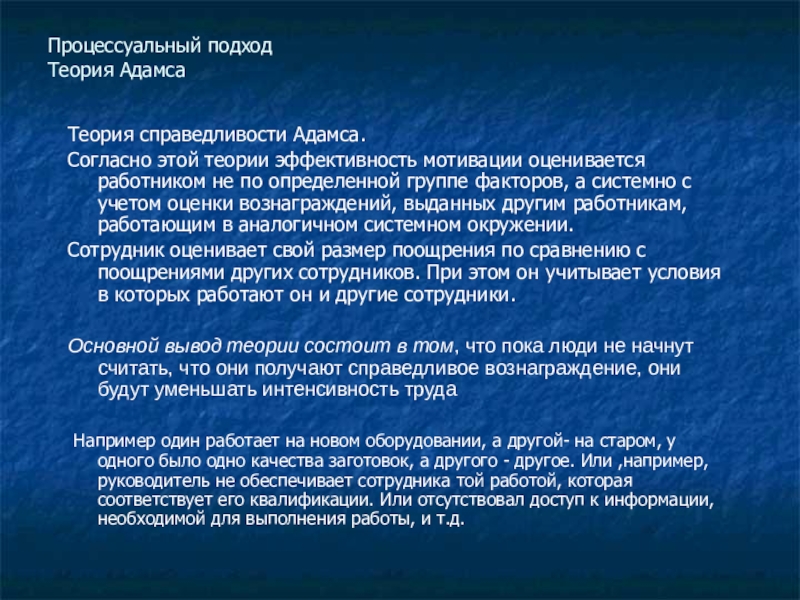 Основной вывод теории состоит в том, что пока люди не начнут считать, что они получают справедливое вознаграждение, они будут уменьшать интенсивность труда