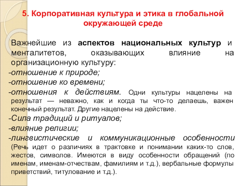 5. Корпоративная культура и этика в глобальной окружающей среде.