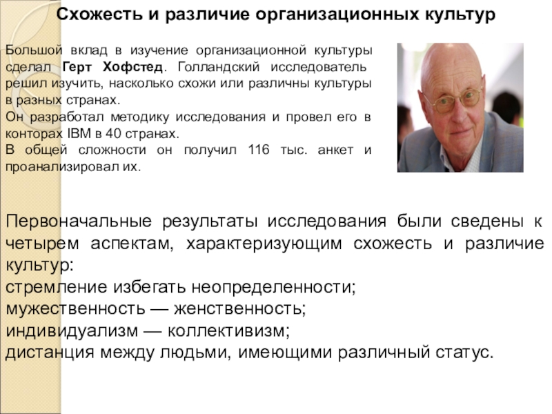 Большой вклад в изучение организационной культуры сделал Герт Хофстед. Голландский исследователь решил изучить, насколько схожи или различны культуры в разных странах.