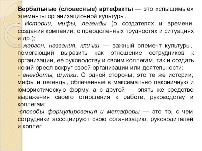 Слайд 11Вербальные (словесные) артефакты — это «слышимые» элементы организационной культуры.