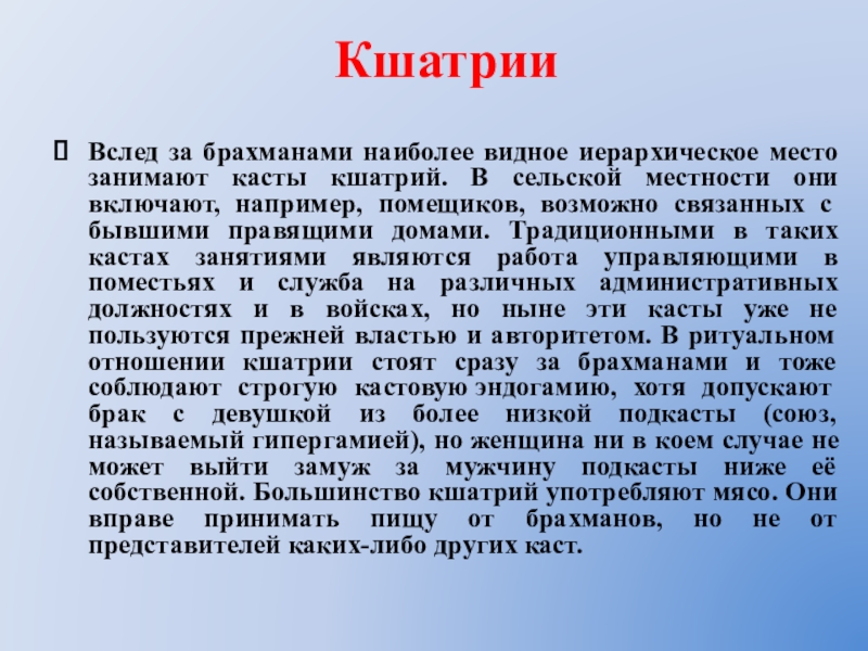 сельской местности они включают, например, помещиков, возможно связанных с бывшими правящими домами. Традиционными в таких кастах занятиями являются работа управляющими в поместьях и служба на различных административных должностях и в войсках, но ныне эти касты уже не пользуются прежней властью и авторитетом. В ритуальном отношении кшатрии стоят сразу за брахманами и тоже соблюдают строгую кастовую эндогамию, хотя допускают брак с девушкой из более низкой подкасты (союз, называемый гипергамией), но женщина ни в коем случае не может выйти замуж за мужчину подкасты ниже её собственной. Большинство кшатрий употребляют мясо. Они вправе принимать пищу от брахманов, но не от представителей каких-либо других каст.