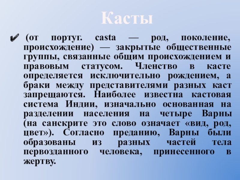 связанные общим происхождением и правовым статусом. Членство в касте определяется исключительно рождением, а браки между представителями разных каст запрещаются. Наиболее известна кастовая система Индии, изначально основанная на разделении населения на четыре Варны (на санскрите это слово означает «вид, род, цвет»). Согласно преданию, Варны были образованы из разных частей тела первозданного человека, принесенного в жертву.