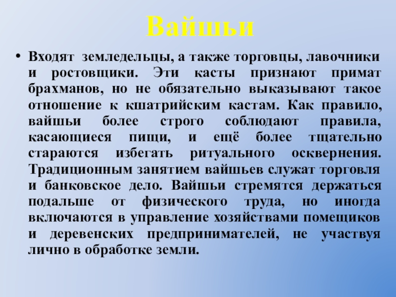 примат брахманов, но не обязательно выказывают такое отношение к кшатрийским кастам. Как правило, вайшьи более строго соблюдают правила, касающиеся пищи, и ещё более тщательно стараются избегать ритуального осквернения. Традиционным занятием вайшьев служат торговля и банковское дело. Вайшьи стремятся держаться подальше от физического труда, но иногда включаются в управление хозяйствами помещиков и деревенских предпринимателей, не участвуя лично в обработке земли.