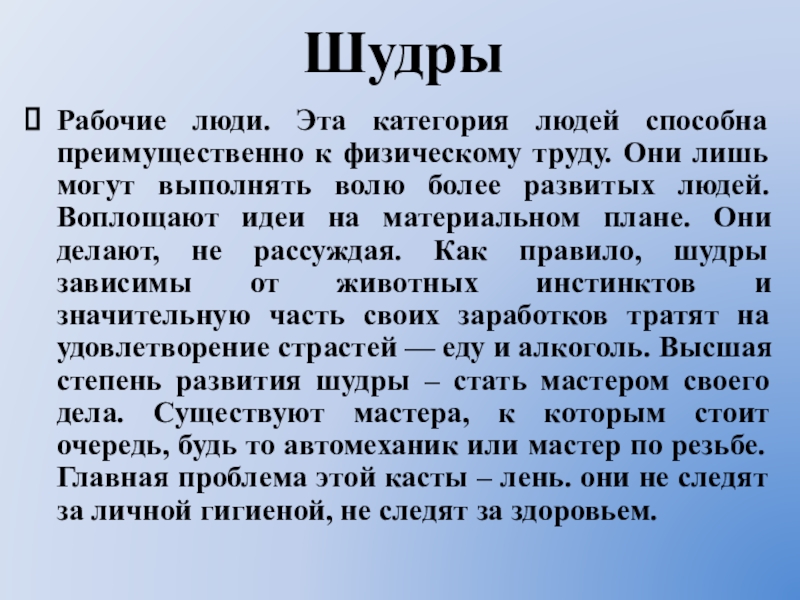 лишь могут выполнять волю более развитых людей. Воплощают идеи на материальном плане. Они делают, не рассуждая. Как правило, шудры зависимы от животных инстинктов и значительную часть своих заработков тратят на удовлетворение страстей — еду и алкоголь. Высшая степень развития шудры – стать мастером своего дела. Существуют мастера, к которым стоит очередь, будь то автомеханик или мастер по резьбе. Главная проблема этой касты – лень. они не следят за личной гигиеной, не следят за здоровьем.