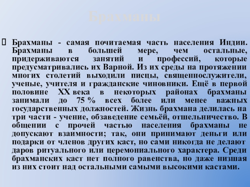 БрахманыБрахманы - самая почитаемая часть населения Индии. Брахманы в большей мере, чем остальные, придерживаются занятий и профессий,