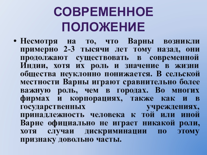 тому назад, они продолжают существовать в современной Индии, хотя их роль и значение в жизни общества неуклонно понижается. В сельской местности Варны играют сравнительно более важную роль, чем в городах. Во многих фирмах и корпорациях, также как и в государственных учреждениях, принадлежность человека к той или иной Варне официально не играет никакой роли, хотя случаи дискриминации по этому признаку довольно часты.