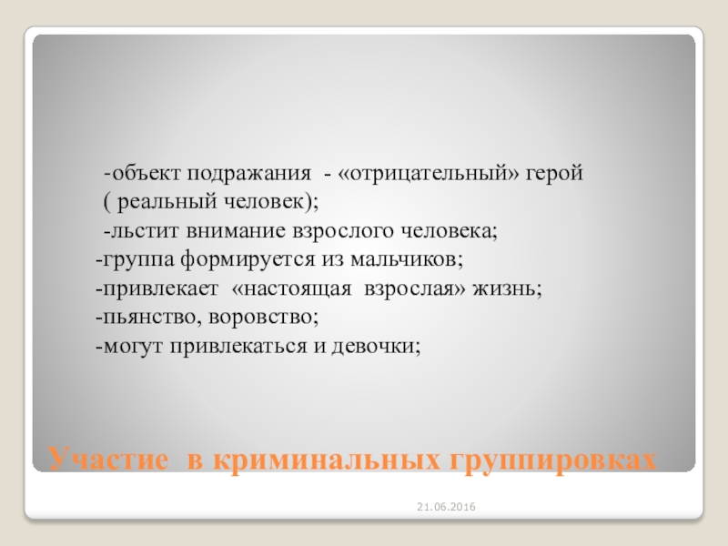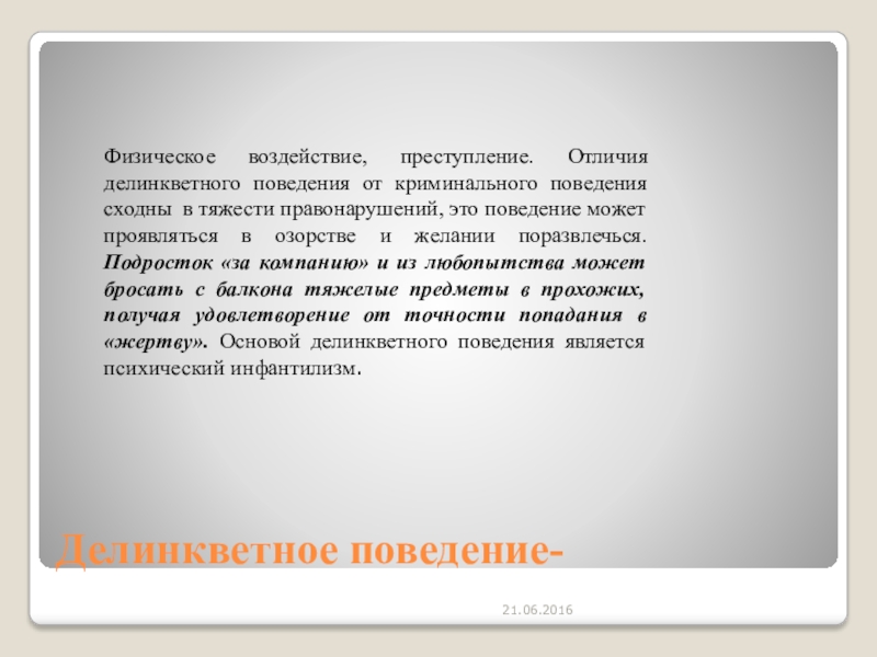 сходны в тяжести правонарушений, это поведение может проявляться в озорстве и желании поразвлечься. Подросток «за компанию» и из любопытства может бросать с балкона тяжелые предметы в прохожих, получая удовлетворение от точности попадания в «жертву». Основой делинкветного поведения является психический инфантилизм.