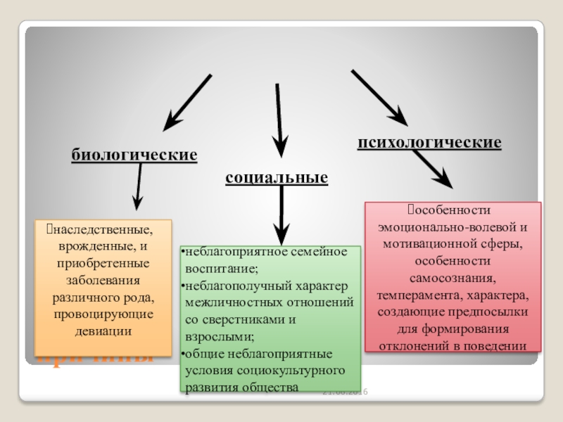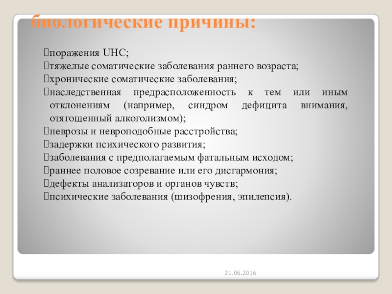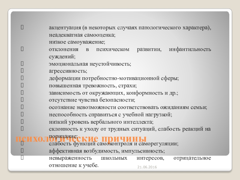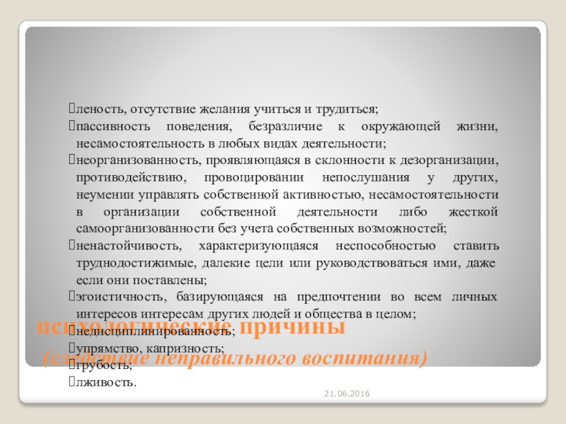 неправильный тип воспитания в семье (неприятие ребенка, гипертрофированное, тревожно-ментальное, эгоцентрическое отношение к нему);