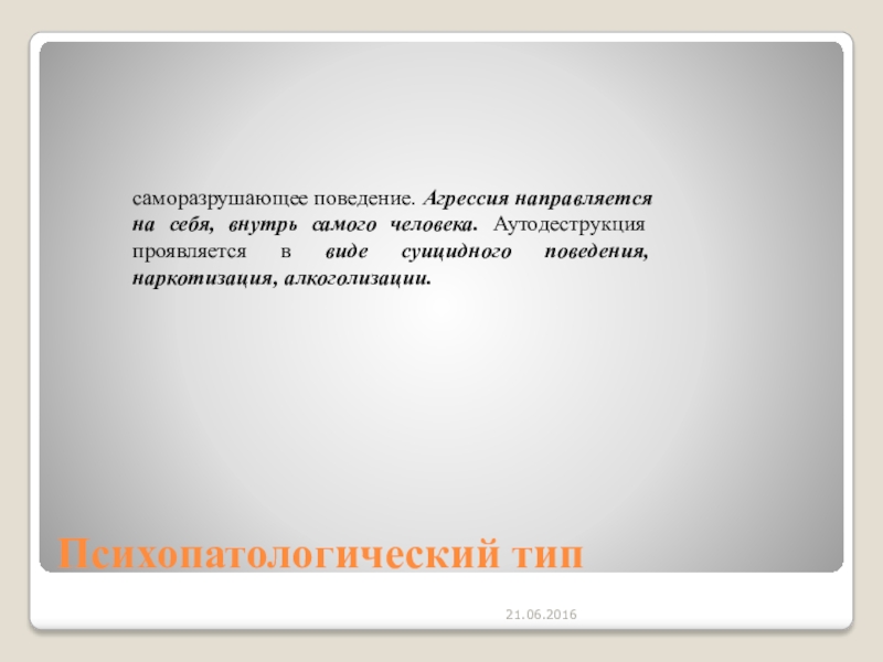 Аутодеструкция проявляется в виде суицидного поведения, наркотизация, алкоголизации.