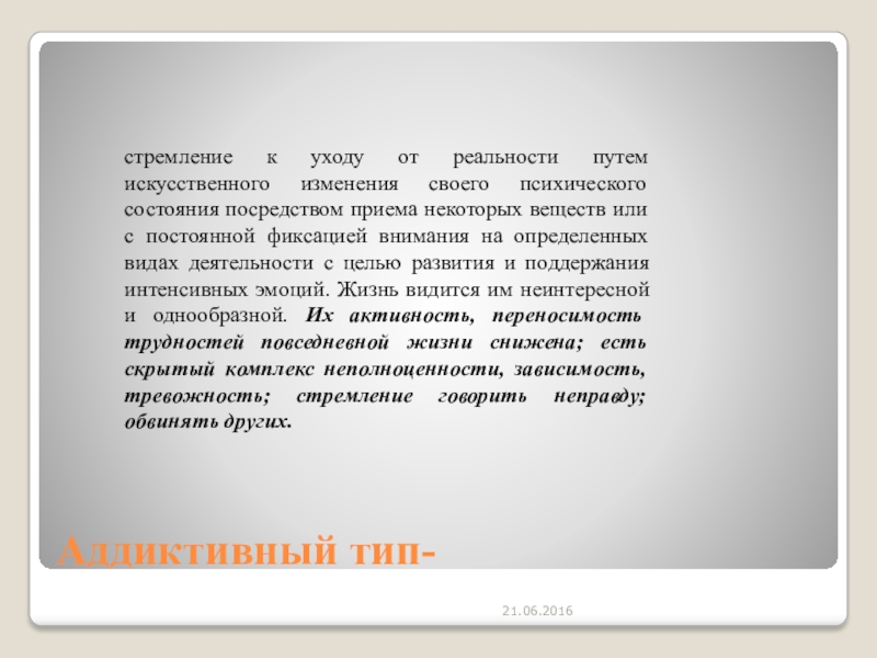 психического состояния посредством приема некоторых веществ или с постоянной фиксацией внимания на определенных видах деятельности с целью развития и поддержания интенсивных эмоций. Жизнь видится им неинтересной и однообразной. Их активность, переносимость трудностей повседневной жизни снижена; есть скрытый комплекс неполноценности, зависимость, тревожность; стремление говорить неправду; обвинять других.